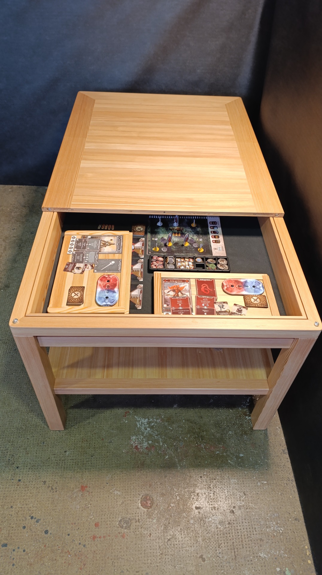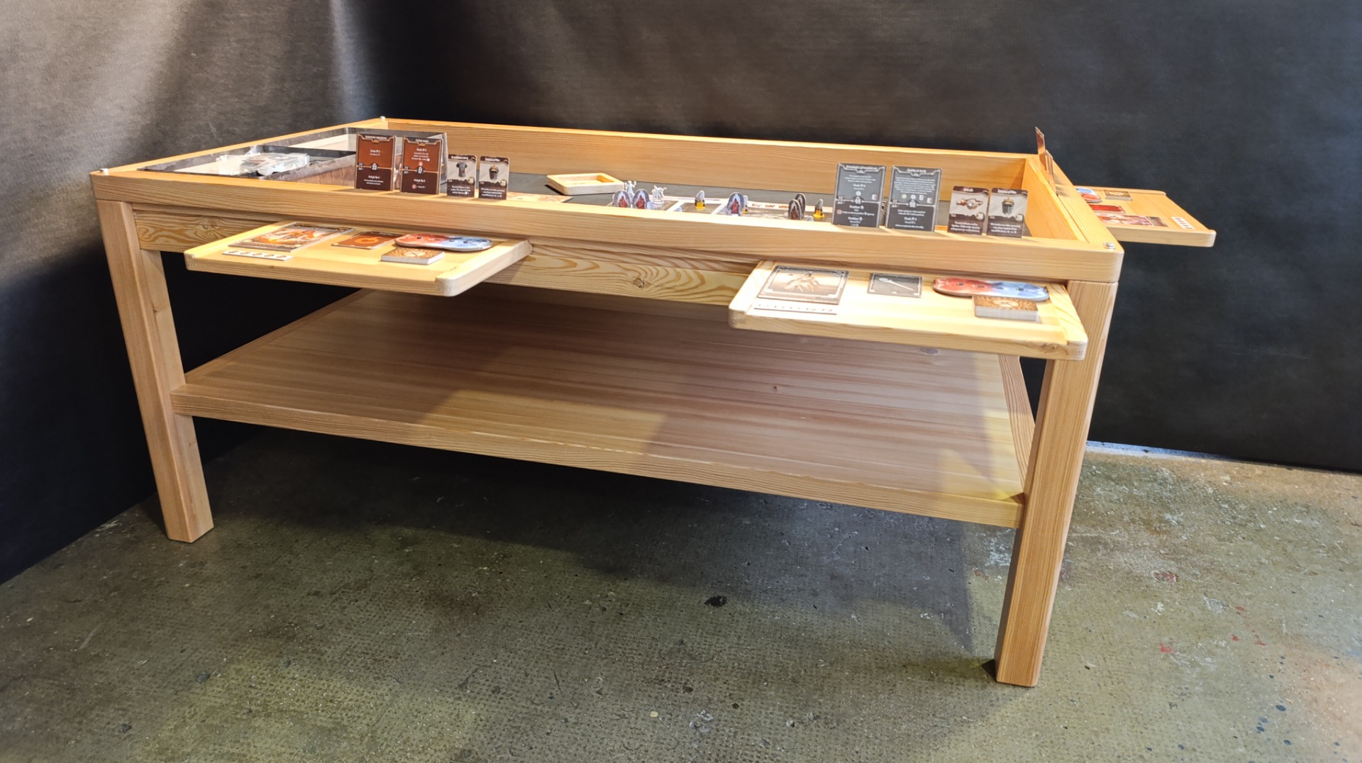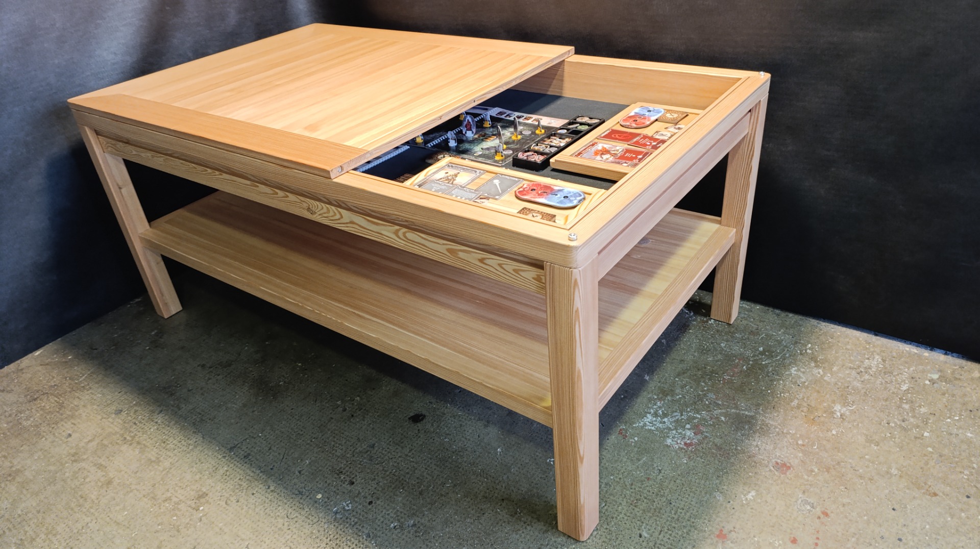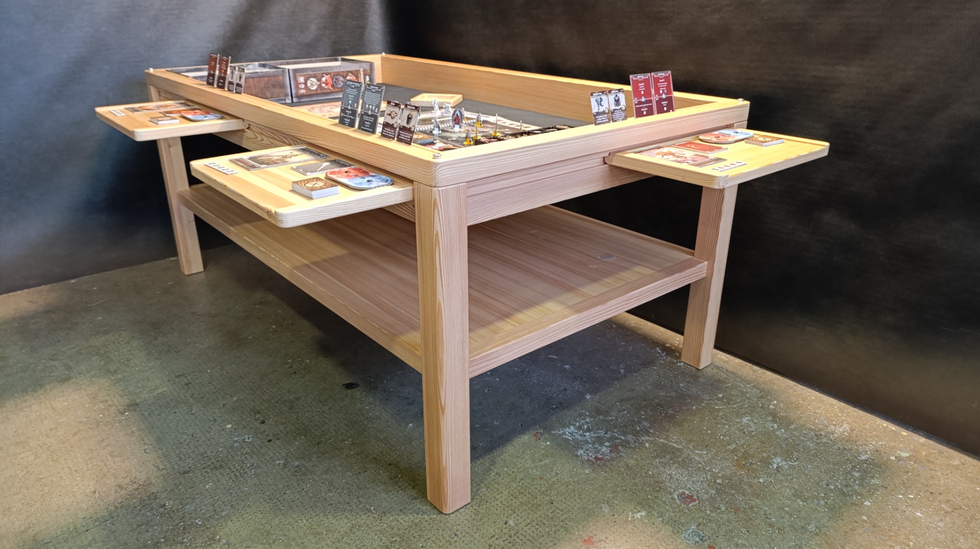 Modřínový masiv, lakovaný. Horní desky děleny na třetiny. EPDM herní podložka, U drážka na karty, rybinová drážka vně stolu. 6ks přídavných XXL držáků na herní materiál 35 x 25cm. Odkládací police.