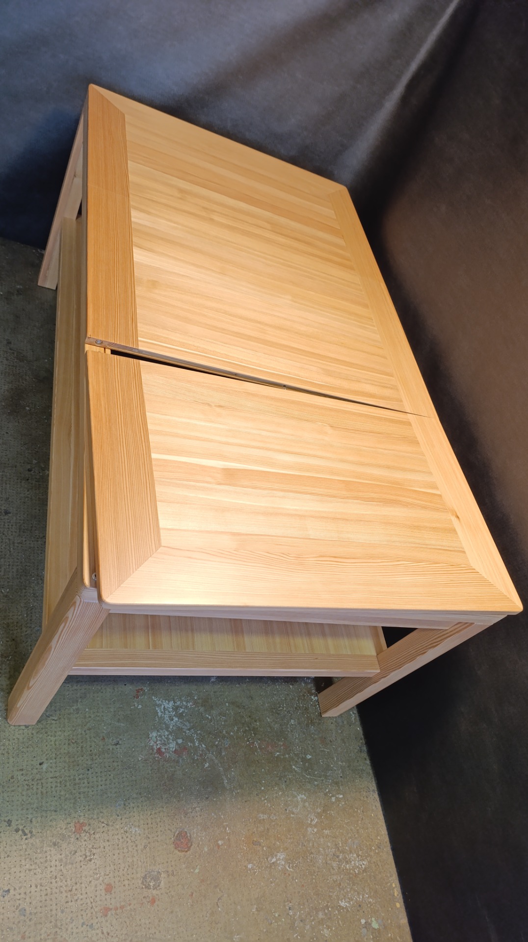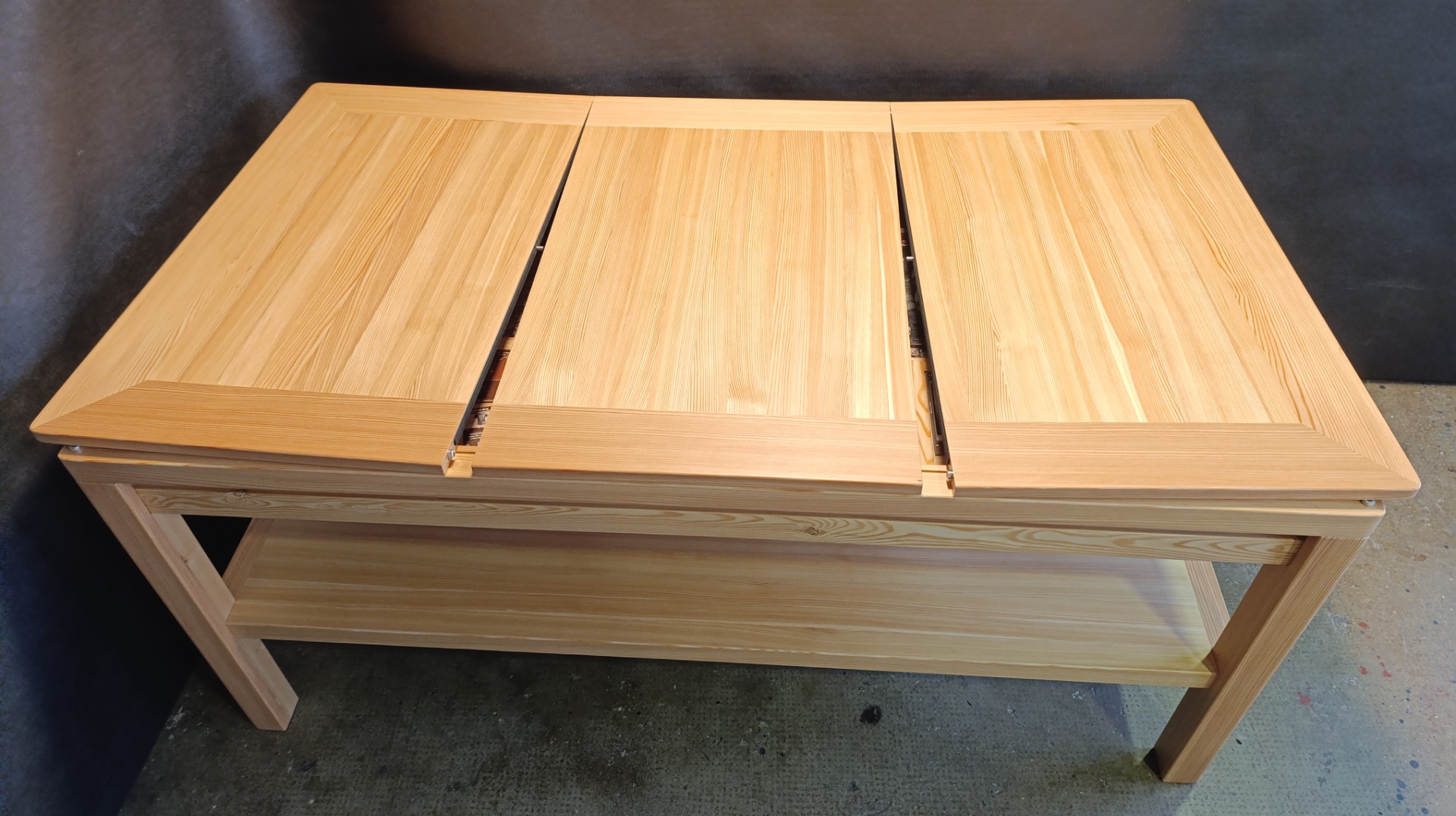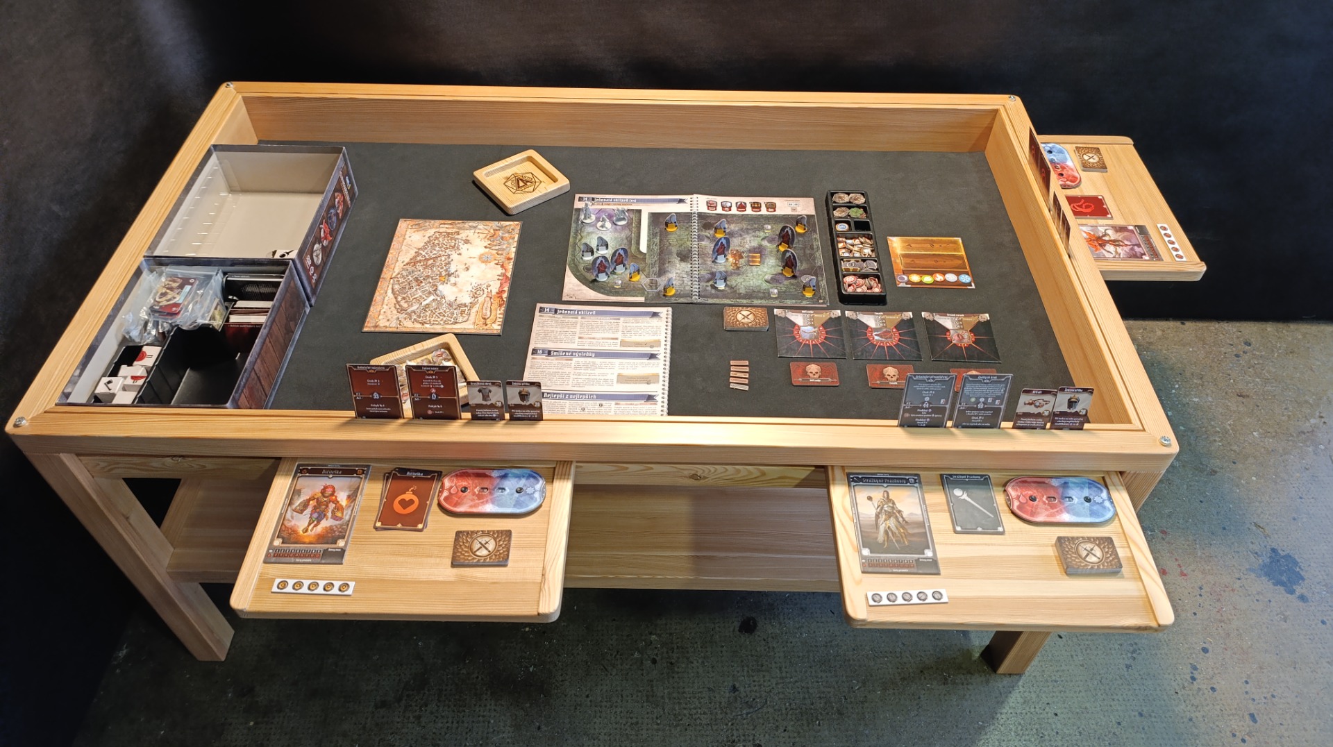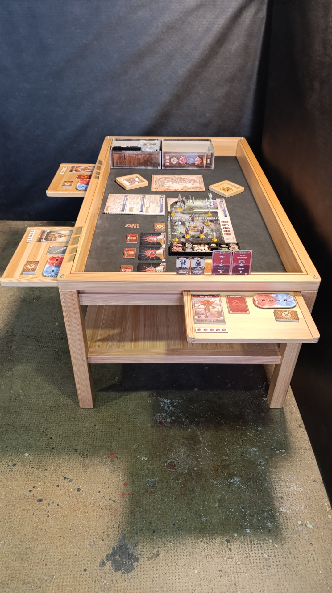 Modřínový masiv, lakovaný. Horní desky děleny na třetiny. EPDM herní podložka, U drážka na karty, rybinová drážka vně stolu. 6ks přídavných XXL držáků na herní materiál 35 x 25cm. Odkládací police.